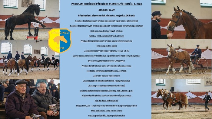 Dějištěm bude krytá jízdárna, průběh akce tedy nenaruší ani případné vrtochy předjarního počasí. Vše zahájí hodinu před polednem předvedení plemenných hřebců v majetku píseckého hřebčince i soukromých vlastníků. Předvaděči z řad zaměstnanců a spolupracovníků hřebčince představí publiku přes tři desítky plemeníků, přičemž nejpočetněji budou zastoupeni teplokrevní a chladnokrevní hřebci. Chybět ale nebudou ani zástupci máločetných plemen, vše s komentářem ke každému koni.