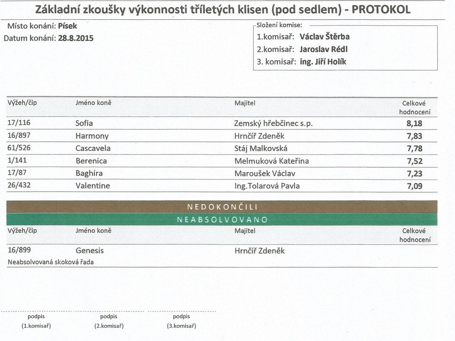 Po drezurní úloze, klusové a postupové řadě byla v součtu výsledků nejlépe hodnocena klisna 17/116 SOFIA po 1231 Przedswit Lionel z matky po Faust Z, chovatel a majitel ZH Písek.